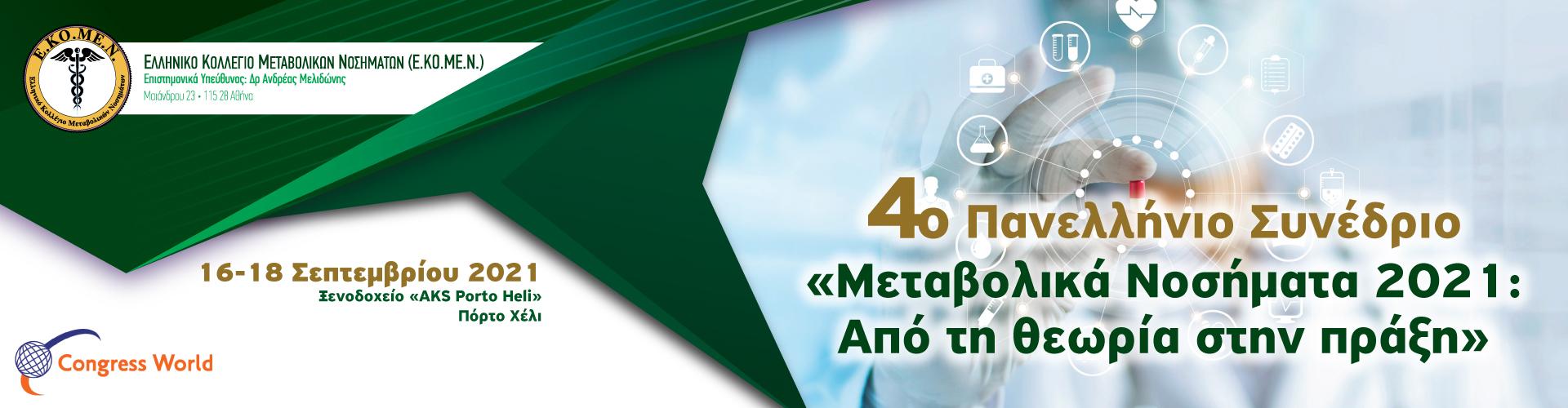 Το Ελληνικό Κολλέγιο Μεταβολικών Νοσημάτων (Ε.ΚΟ.ΜΕ.Ν.) μετά από μια 9ετία έντονης παρουσίας στα εκπαιδευτικά και επιστημονικά δρώμενα και αφού οργάνωσε και πραγματοποίησε περισσότερες από είκοσι εκπαιδευτικές Διημερίδες και Τριημερίδες σε όλη την Ελλάδα, εξαγγέλλει και οριοθετεί το 4ο Πανελλήνιο Συνέδριο ΕΚΟΜΕΝ που θα λάβει χώρα στο Πόρτο Χέλι στις 16-18 Σεπτεμβρίου 2021.