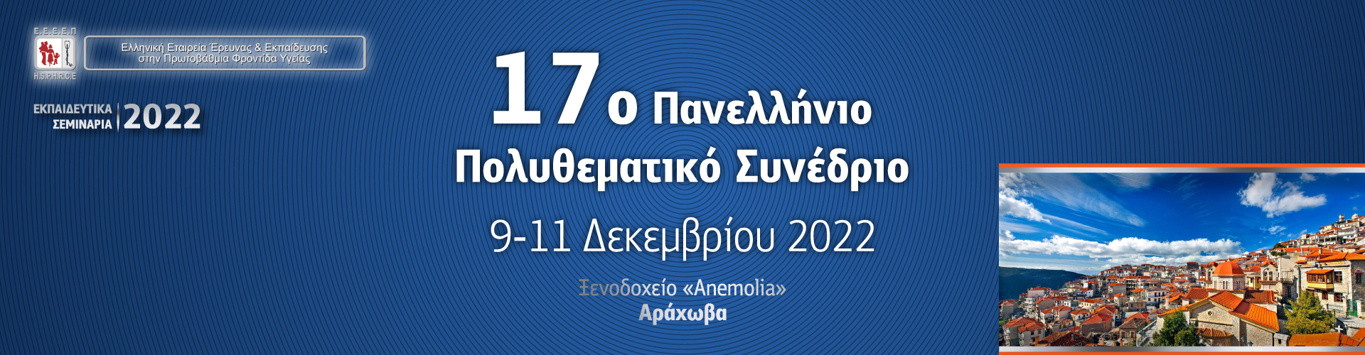Tο Διοικητικό Συμβούλιο της Ελληνικής Εταιρείας Έρευνας και Εκπαίδευσης στην Πρωτοβάθμια Φροντίδα Υγείας (ΕΕΕΕΠ) σας καλωσορίζει στο 17 Πανελλήνιο Πολυθεματικό Συνέδριο που πραγματοποιείται στην Αράχωβα από 9 έως 11 Δεκεμβρίου 2022. Η πανδημία από τα μέσα του 2020 δεν επέτρεψε επιστημονικές εκδηλώσεις να πραγματοποιούνται με ζωντανή συμμετοχή και ευελπιστούμε ότι φέτος το σταθερό αυτό σημείο επαφής στα επιστημονικά δρώμενα της ΠΦΥ να μπορέσει να πραγματοποιηθεί δια ζώσης. Τα θέματα που θα αναλυθούν στην φετινή συνάντηση θεωρούμε ότι θα καλύψουν μεγάλο μέρος των αναγκών των Ιατρών της ΠΦΥ και εξαίρετοι πανεπιστημιακοί δάσκαλοι και ιατροί του ΕΣΥ θα παρουσιάσουν σύγχρονα δεδομένα.