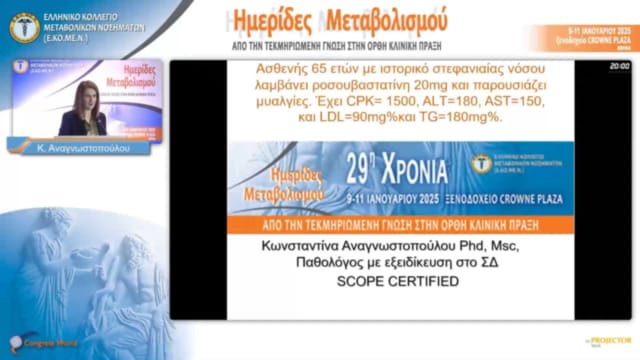 Ασθενής 65 ετών με ιστορικό Στεφανιαίας Νόσου λαμβάνει ροσουβαστατίνη 20mg και παρουσιάζει μυαλγίες. Έχει CPK=1500, ALT=180, AST=150, LDL=90mg% και TG=180mg% | Κ. Αναγνωστοπούλου