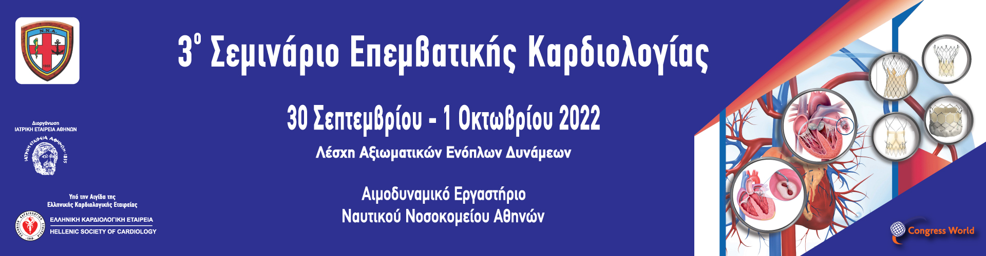 Στο πλαίσιο της συνεχιζόμενης ιατρικής εκπαίδευσης το Αιμοδυναμικό Εργαστήριο του Ναυτικού Νοσοκομείου Αθηνών (Ν.Ν.Α.) διοργανώνει το 3ο Σεμινάριο Επεμβατικής Καρδιολογίας, το οποίο θα πραγματοποιηθεί στις 30 Σεπτεμβρίου και 1η Οκτωβρίου 2022, στην Αθήνα (Αίθουσα Τιμών Λέσχης Αξιωματικών) με μετάδοση σε πραγματικό χρόνο, περιστατικών (Διαδερμική τοποθέτηση αορτικής βαλβίδας-TAVI, Σύγκλειση ανοικτού ωοειδούς τρήματος-PFO ή μεσοκολπικής επικοινωνίας-ASD)όπως είχε γίνει και στα 2 προηγούμενα σεμινάρια, που θα διενεργούνται στο Αιμοδυναμικό εργαστήριο του ΝΝΑ (Live demonstrations) με σύγχρονο και ταυτόχρονο σχολιασμό από τους παρευρισκομένους εκλεκτούς προσκεκλημένους καρδιολόγους και καρδιοχειρουργούς. Διαλέξεις από έγκριτους Έλληνες και ξένους ομιλητές για το μέλλον της συνεργασίας της Καρδιολογίας, της Καρδιοχειρουργικής και της Αγγειοχειρουργικής και πώς αυτό διαμορφώνεται μεσα από την διαδερμική αντιμετώπιση των βαλβιδοπαθειών και την αντιμετώπιση της περιφερικής αρτηριακής νόσου. Workshops για Ειδικευόμενους και νέους καρδιολόγους. Στρογγυλές τράπεζες με ενδιαφέροντα θέματα πού άπτονται της συνεργασίας της Επεμβατικής Καρδιολογίας με την Νευρολογία, την Παιδιατρική, την Αναισθησιολογία την Καρδιοχειρουργική, την επεμβατική αντιμετώπιση της καρδιακής ανεπάρκειας και της στεφανιαίας νόσου.