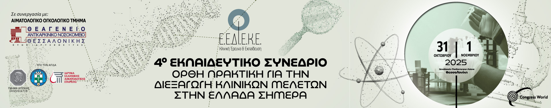 Η Επιστημονική Εταιρεία Διαρκούς Εκπαίδευσης στην Κλινική Έρευνα (Ε.Ε.ΔΙ.Ε.Κ.Ε.), σε συνεργασία με το Αιματολογικό - Ογκολογικό Τμήμα του Αντικαρκινικού Νοσοκομείου «ΘΕΑΓΕΝΕΙΟ», έχει τη χαρά και την τιμή να διοργανώνει για τέταρτη συνεχή χρονιά Εκπαιδευτικό Συνέδριο με τίτλο: «Ορθή Πρακτική για τη Διεξαγωγή Κλινικών Μελετών στην Ελλάδα Σήμερα», το οποίο θα πραγματοποιηθεί στις 31 Οκτωβρίου και 1 Νοεμβρίου 2025, στη Θεσσαλονίκη, στο ξενοδοχείο «Mediterranean Palace».