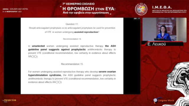 Χειρισμός γυναικών με ατομικό ιστορικό φλεβικής ή αρτηριακής θρόμβωσης ή γνωστή θρομβοφιλία που πρόκειται να υποβληθούν σε υποβοηθούμενη αναπαραγωγή ή να λάβουν ορμονική θεραπεία | Ε. Λευκού
