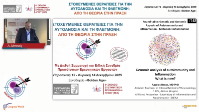 15.30–17.30 | ΣΤΡΟΓΓΥΛΗ ΤΡΑΠΕΖΑ: ΓΕΝΕΤΙΚΑ ΚΑΙ ΓΟΝΙΔΙΩΜΑΤΙΚΑ ΔΕΔΟΜΕΝΑ ΣΤΗΝ ΑΥΤΟΑΝΟΣΙΑ ΚΑΙ ΤΗΝ ΦΛΕΓΜΟΝΗ ΚΑΙ Η ΣΗΜΑΣΙΑ ΤΟΥΣ ΓΙΑ ΤΗ ΚΛΙΝΙΚΗ ΠΡΑΞΗ – ΜΕΤΑΒΟΛΙΚΗ ΚΑΙ ΟΣΤΙΚΗ ΦΛΕΓΜΟΝΗ