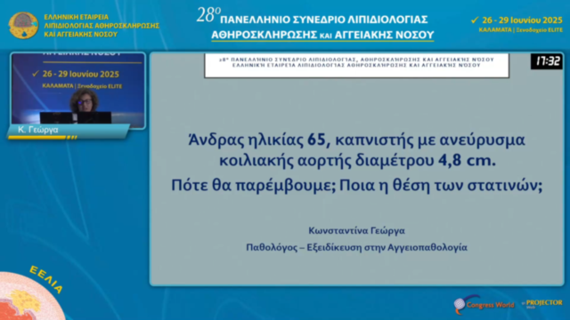 Άνδρας ηλικίας 65 καπνιστής με ανεύρυσμα κοιλιακής αορτής διαμέτρου 4,8 cm. Πότε θα παρέμβουμε; Ποια η θέση των στατινών; | Κ. Γεώργα
