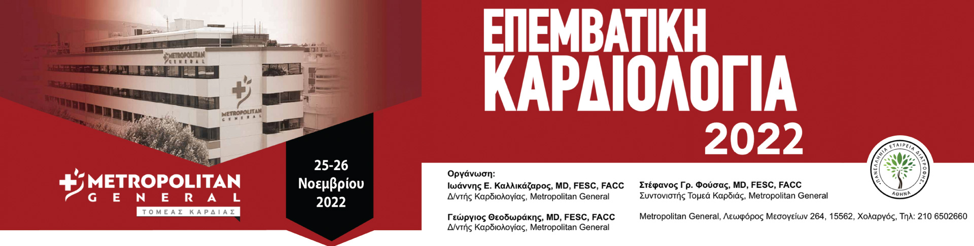 Ο Τομέας Καρδιάς του METROPOLITAN GENERAL σε συνεργασία με την Πανελλήνια Εταιρεία Διατροφής σας καλωσορίζουν στο Συνέδριο «ΕΠΕΜΒΑΤΙΚΗ ΚΑΡΔΙΟΛΟΓΙΑ 2022», που πραγματοποιείται διαδικτυακά, στις 25 & 26 Νοεμβρίου 2022.