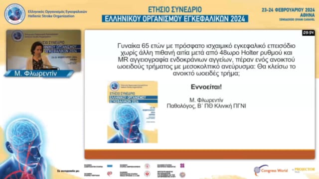 12.30-13.00 DABATE: ΓΥΝΑΙΚΑ 65 ΕΤΩΝ ΜΕ ΠΡΟΣΦΑΤΟ ΙΣΧΑΙΜΙΚΟ ΕΓΚΕΦΑΛΙΚΟ ΕΠΕΙΣΟΔΙΟ ΧΩΡΙΣ ΑΛΛΗ ΠΙΘΑΝΗ ΑΙΤΙΑ ΜΕΤΑ ΑΠΟ 48ΩΡΟ HOLTER ΡΥΘΜΟΥ ΚΑΙ MR ΑΓΓΕΙΟΓΡΑΦΕΙΑΣ ΕΝΔΟΚΡΑΝΙΩΝ ΑΓΓΕΙΩΝ, ΠΕΡΑΝ ΕΝΟΣ ΑΝΟΙΚΤΟΥ ΩΟΕΙΔΟΥΣ ΤΡΗΜΑΤΟΣ ΜΕ ΜΕΣΟΚΟΛΠΙΚΟ ΑΝΕΥΡΥΣΜΑ