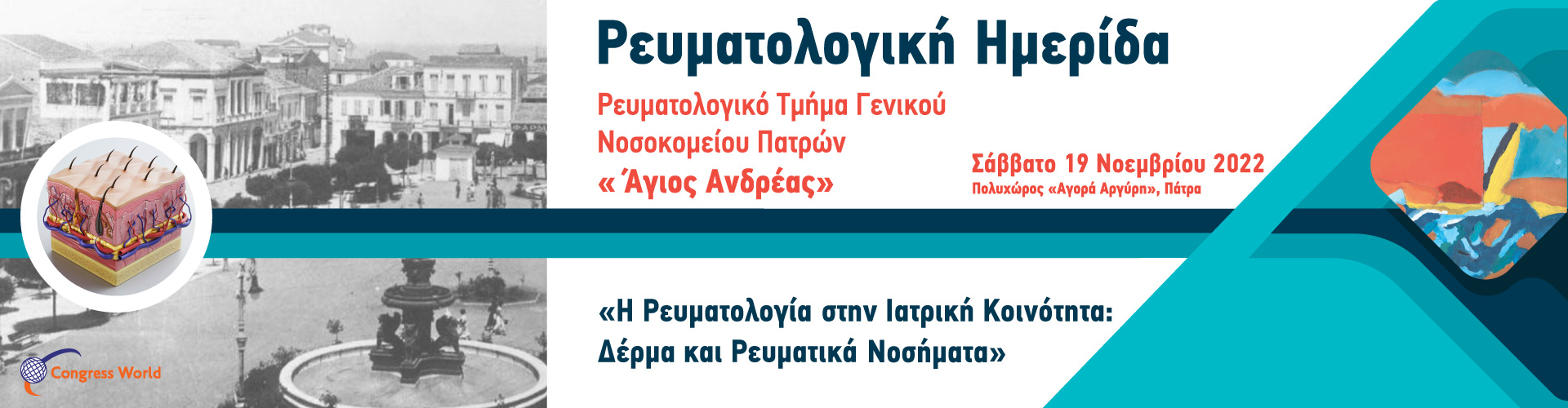 Με ιδιαίτερη χαρά σας ανακοινώνουμε ότι το Ρευματολογικό Τμήμα του Γενικού Νοσοκομείου Πατρών «ο Άγιος Ανδρέας», σταθερά προσανατολισμένο στην προσπάθεια αλληλοενημέρωσης με τους Ιατρούς των άλλων ειδικοτήτων, διοργανώνει για τέταρτη χρονιά την επιστημονική συνάντηση «Η Ρευματολογία στην Ιατρική Kοινότητα», με θέμα «Δέρμα και Ρευματικά Νοσήματα». Η ημερίδα θα πραγματοποιηθεί το Σάββατο, 19 Νοεμβρίου 2022, στην Πάτρα, στην Αγορά Αργύρη.