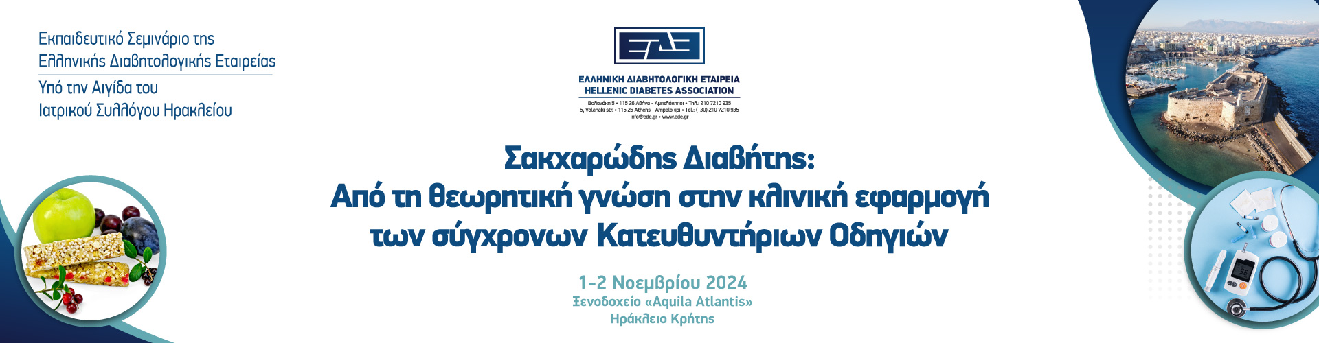 Η Ελληνική Διαβητολογική Εταιρεία, υπό την Αιγίδα του Ιατρικού Συλλόγου Ηρακλείου, διοργανώνει το Εκπαιδευτικό Σεμινάριο «Σακχαρώδης Διαβήτης: Από τη θεωρητική γνώση στην κλινική εφαρμογή των σύγχρονων Κατευθυντήριων Οδηγιών της ΕΔΕ», στο Ηράκλειο. Το Σεμινάριο θα διεξαχθεί υβριδικά, με φυσική παρουσία αλλά και με δυνατότητα διαδικτυακής παρακολούθησης.