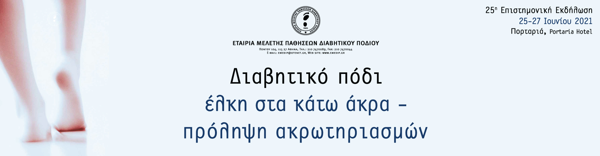 Σας ευχαριστούμε που συμμετέχετε στη 25η Επιστημονική Εκδήλωση της Εταιρίας Μελέτης Παθήσεων Διαβητικού Ποδιού με θέμα «Διαβητικό Πόδι: Έλκη στα κάτω άκρα – πρόληψη ακρωτηριασμών».