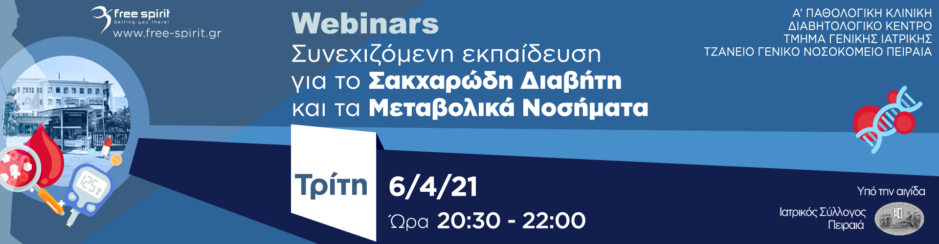 Σας ευχαριστούμε που συμμετέχετε στο 3ο διαδικτυακό σεμινάριο με θέμα «Συνεχιζόμενη Εκπαίδευση για το Σακχαρώδη Διαβήτη και τα Μεταβολικά Νοσήματα» που Διοργανώνει η Α’ Παθολογική Κλινική, Διαβητολογικό Κέντρο, Τμήμα Γενικής Ιατρικής του Γενικού Νοσοκομείου Πειραιώς «Τζάνειο».