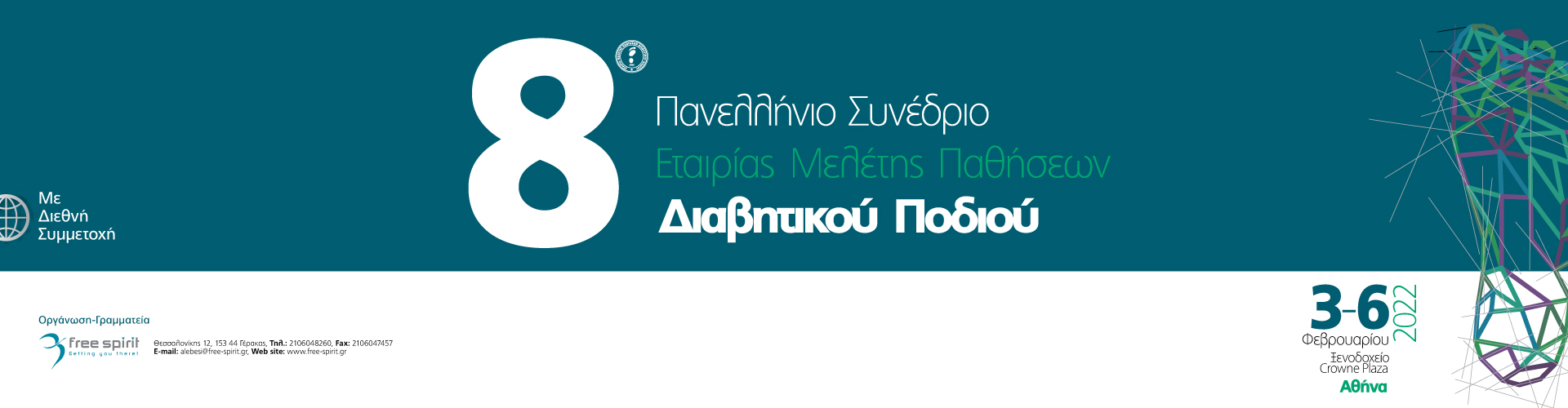 Σας ευχαριστούμε που συμμετέχετε στο 8° Πανελλήνιο Συνέδριο Εταιρίας Μελέτης Παθήσεων Διαβητικού Ποδιού, το οποίο θα διεξαχθεί 3-6 Φεβρουαρίου 2022.