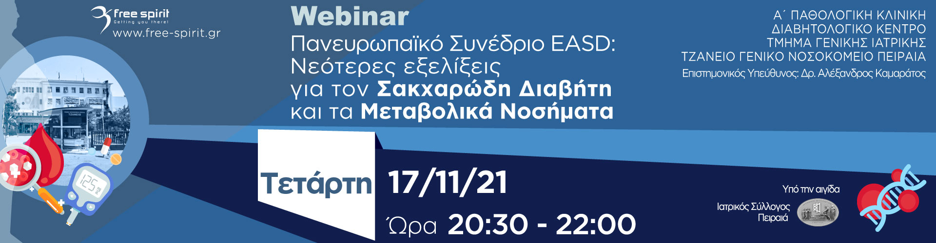 Σας ευχαριστούμε που συμμετέχετε στο Webinar με θέμα «Πανευρωπαϊκό Συνέδριο EASD: Νεότερες εξελίξεις για τον Σακχαρώδη Διαβήτη και τα μεταβολικά νοσήματα» που Διοργανώνει η Α’ Παθολογική Κλινική, Διαβητολογικό Κέντρο, Τμήμα Γενικής Ιατρικής του Γενικού Νοσοκομείου Πειραιώς «Τζάνειο».