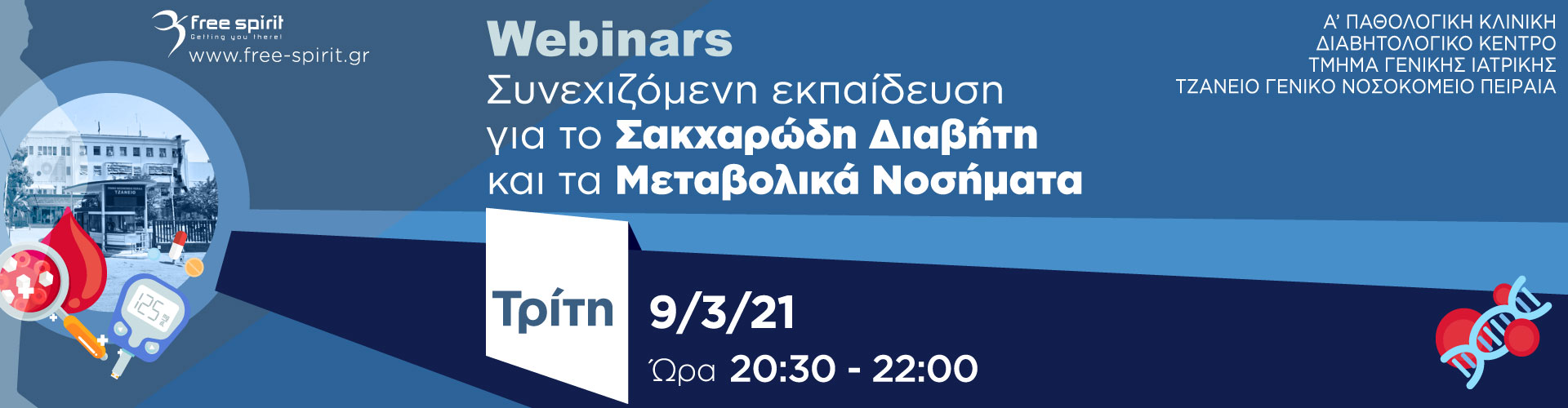 Σας ευχαριστούμε που συμμετέχετε στο 2ο διαδικτυακό σεμινάριο με θέμα «Συνεχιζόμενη Εκπαίδευση για το Σακχαρώδη Διαβήτη και τα Μεταβολικά Νοσήματα» που Διοργανώνει η Α’ Παθολογική Κλινική, Διαβητολογικό Κέντρο, Τμήμα Γενικής Ιατρικής του Γενικού Νοσοκομείου Πειραιώς «Τζάνειο»
