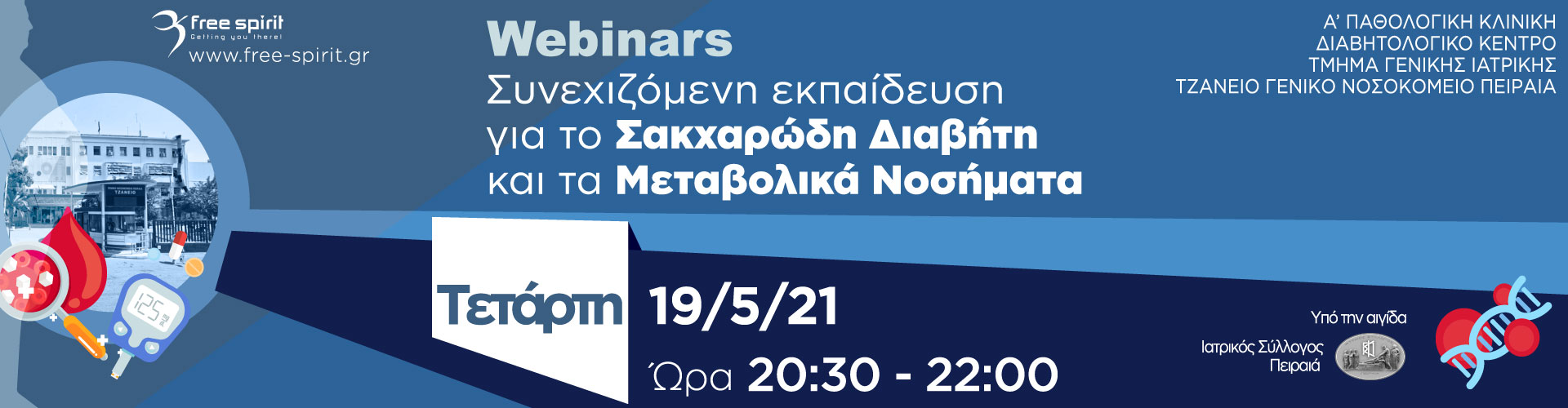 Σας ευχαριστούμε που συμμετέχετε στο 5ο διαδικτυακό σεμινάριο με θέμα «Συνεχιζόμενη Εκπαίδευση για το Σακχαρώδη Διαβήτη και τα Μεταβολικά Νοσήματα» που Διοργανώνει η Α’ Παθολογική Κλινική, Διαβητολογικό Κέντρο, Τμήμα Γενικής Ιατρικής του Γενικού Νοσοκομείου Πειραιώς «Τζάνειο».