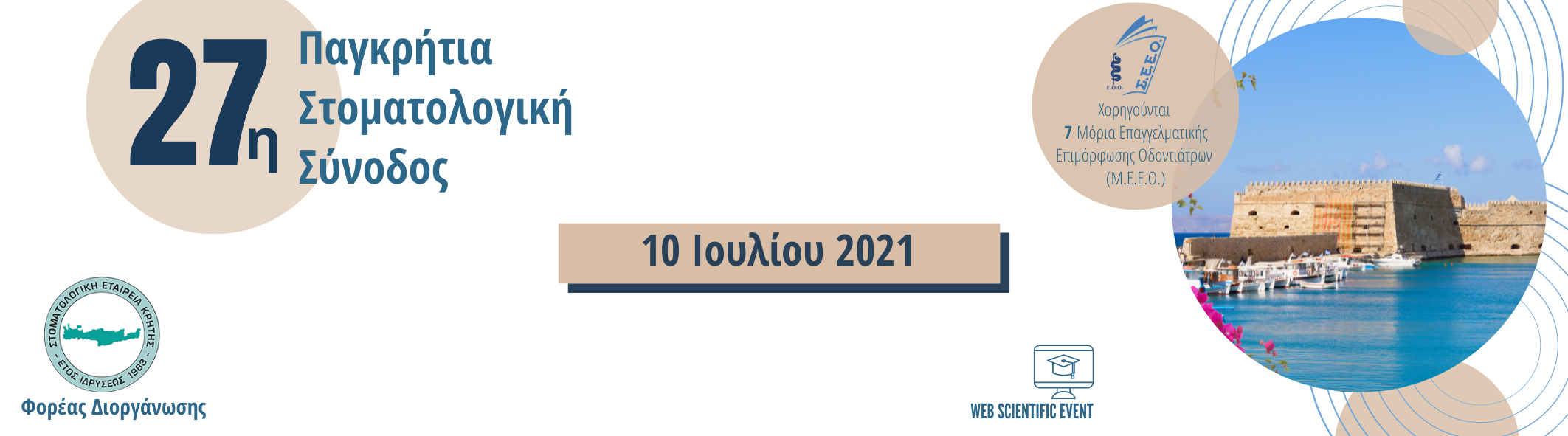Με ιδιαίτερη χαρά σας παρουσιάζω το διαδικτυακό χώρο και το πρόγραμμα της 27ης Παγκρήτιας Συνόδου της Στοματολογικής Εταιρείας Κρήτης που θα πραγματοποιηθεί στις 10 Ιουλίου 2021.