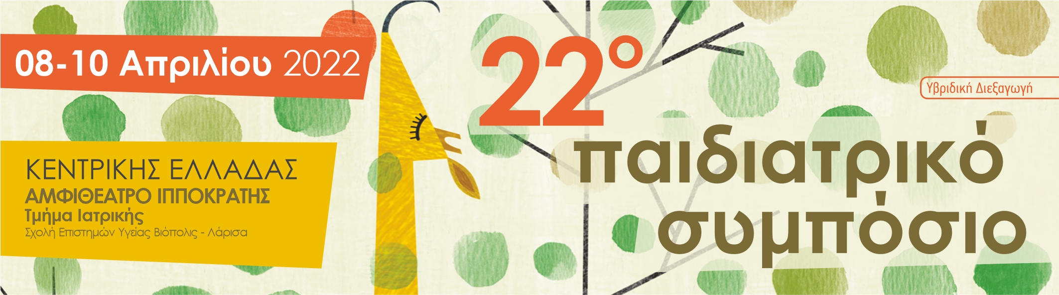 Το 22ο Παιδιατρικό Συμπόσιο Κεντρικής Ελλάδας, το οποίο διοργανώνεται από την Εταιρεία Παιδιατρικής Εκπαίδευσης και Έρευνας Κεντρικής Ελλάδας (ΕΠΕΕΚΕ) σε συνεργασία με την Παιδιατρική Κλινική του Πανεπιστημίου Θεσσαλίας θα πραγματοποιηθεί στις 8-9-10 Απριλίου 2022 στο Αμφιθέατρο Ιπποκράτης, Τμήμα Ιατρικής, Σχολή Επιστημών Υγείας, Βιόπολις, στη Λάρισα.