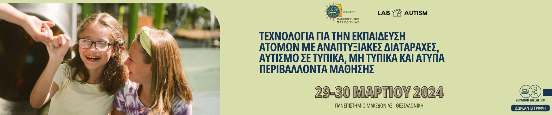 Το Τμήμα Εκπαιδευτικής και Κοινωνικής Πολιτικής και το Εργαστήριο Αυτισμού-Διάχυτων Αναπτυξιακών Διαταραχών και της Συμπεριφοράς του Ανθρώπου οργανώνουν συνέδριο με τίτλο «Τεχνολογία για την Εκπαίδευση Ατόμων με Αναπτυξιακές Διαταραχές, αυτισμό σε Τυπικά, μη Τυπικά και Άτυπα Περιβάλλοντα Μάθησης».