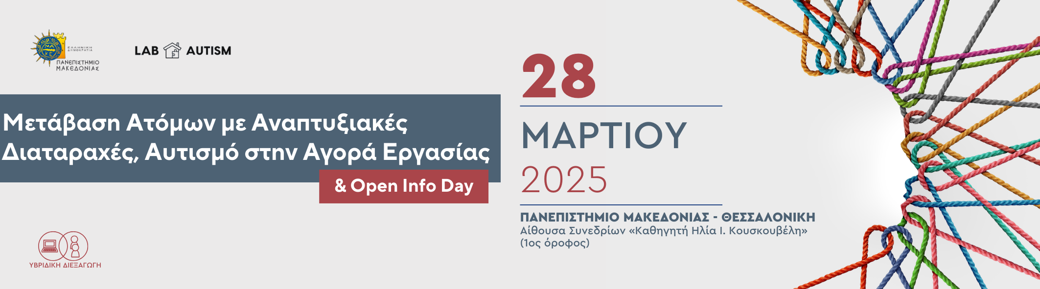 Σας καλωσορίζω στο Συνέδριο και στο Open Info Day* με τίτλο «Μετάβαση Ατόμων με Αναπτυξιακές Διαταραχές, Αυτισμό στην Αγορά Εργασίας» το οποίο θα πραγματοποιηθεί την Παρασκευή 28 Μαρτίου 2025 στην Αίθουσα Συνεδρίων «Καθηγητή Ηλία Ι. Κουσκουβέλη» στον 1ο όροφο του Πανεπιστημίου Μακεδονίας, υβριδικά.
