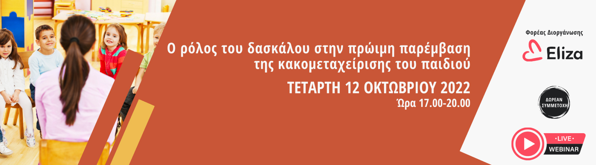 Το Σωματείο ΕΛΙΖΑ – Εταιρία κατά της Κακοποίησης του Παιδιού διοργανώνει webinar επιμόρφωσης νηπιαγωγών & εκπαιδευτικών με τίτλο «Ο ρόλος του δασκάλου στην πρώιμη παρέμβαση της κακομεταχείρισης του παιδιού», ώστε να είναι σε θέση να αναγνωρίζουν τα σημάδια που οδηγούν σε υποψία κακοποίησης, αλλά και να αντιληφθούν την αναγκαιότητα της αναγνώρισης.