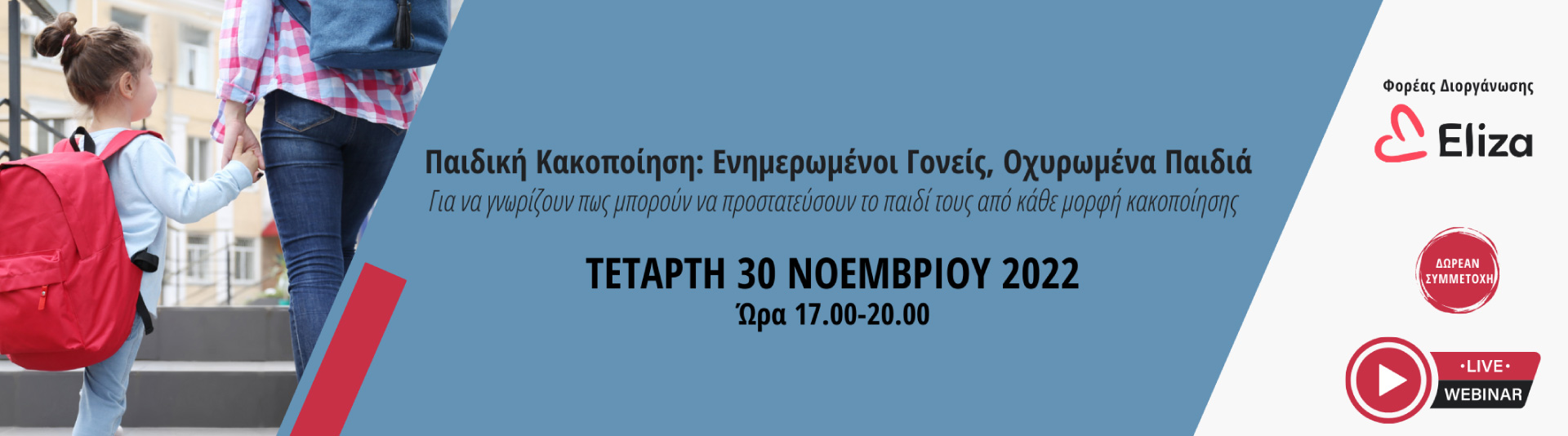 Το Σωματείο ΕΛΙΖΑ – Εταιρία κατά της Κακοποίησης του Παιδιού διοργανώνει webinar επιμόρφωσης γονέων με τίτλο «Παιδική Κακοποίηση: Ενημερωμένοι Γονείς, Οχυρωμένα Παιδιά», ώστε να είναι σε θέση να αναγνωρίζουν τα σημάδια που οδηγούν σε υποψία κακοποίησης, αλλά και να αντιληφθούν την αναγκαιότητα της πρόληψης.