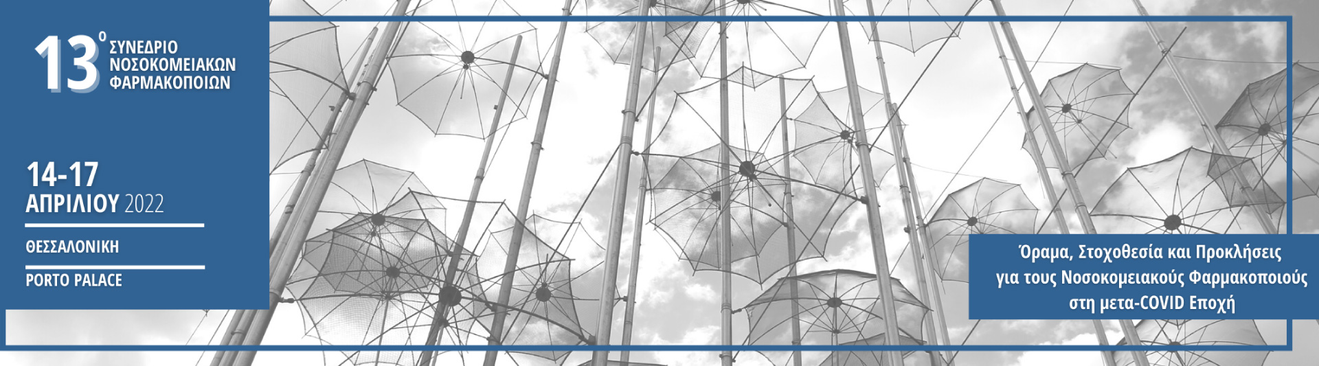 Με ιδιαίτερη χαρά σας προσκαλώ -εκ μέρους του ΔΣ της Π.Ε.Φ.Ν.Ι.- στην όμορφη Θεσσαλονίκη & στο 13ο Πανελλήνιο Συνέδριο Νοσοκομειακών Φαρμακοποιών που διοργανώνουμε στις 14-17 Απριλίου 2022, στο ξενοδοχείο Porto Palace, με θέμα «Όραμα, Στοχοθεσία και Προκλήσεις για τους Νοσοκομειακούς Φαρμακοποιούς στη μετα-COVID Εποχή» . Είναι το δεύτερο Συνέδριο μας που θα πραγματοποιηθεί υβριδικά, με φυσική παρουσία για όσους καταφέρουν να βρεθούν κοντά μας & ταυτόχρονη διαδικτυακή μετάδοση για τους υπόλοιπους εγγεγραμμένους συνέδρους.