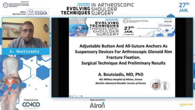 A. Boutsiadis | Adjustable Button and All-Suture Anchors as Suspensory Devices for Arthroscopic Glenoid Rim Fracture Fixation. Surgical technique and preliminary results