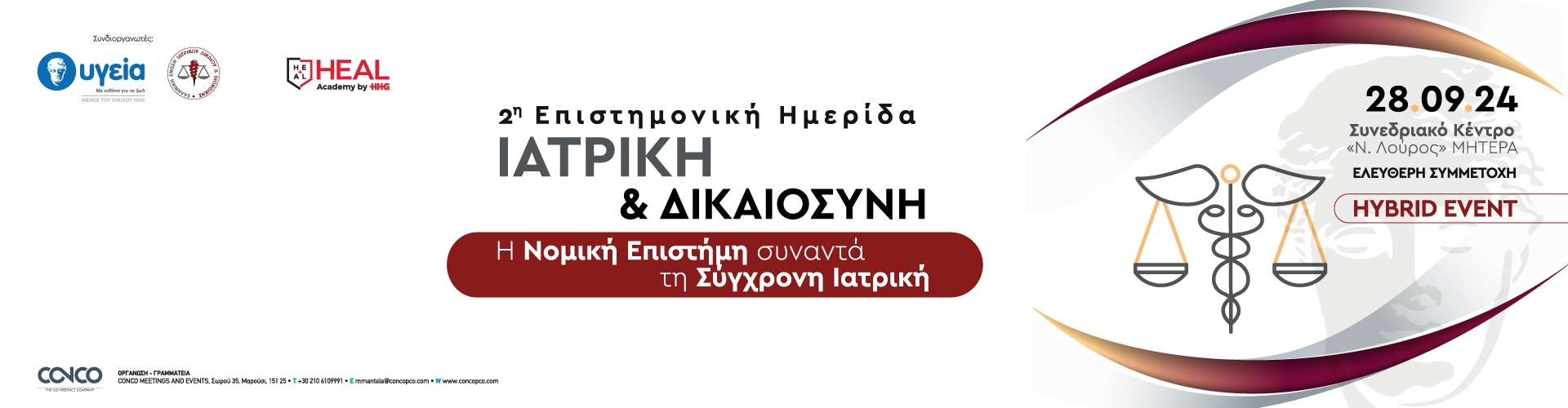 Με ιδιαίτερη χαρά σας ανακοινώνουμε τη διοργάνωση της 2ης Ιατρονομικής Επιστημονικής Ημερίδας, με τίτλο «ΙΑΤΡΙΚΗ & ΔΙΚΑΙΟΣΥΝΗ: Η Νομική Επιστήμη συναντά τη Σύγχρονη Ιατρική».