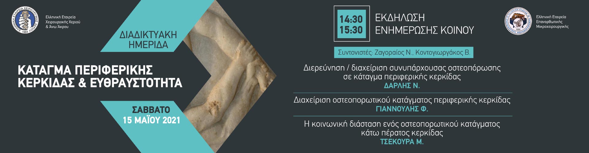 Με κεντρικό θέμα «Κατάγματα Περιφερικής Κερκίδας και Ευθραυστότητα» πραγματοποιείται το Σάββατο 15 Μαΐου 2021 διαδικτυακή ημερίδα στο πλαίσιο μίας συστηματικής προσέγγισης των καταγμάτων ευθραυστότητας του άνω άκρου ως επιπλοκή της οστεοπόρωσης.